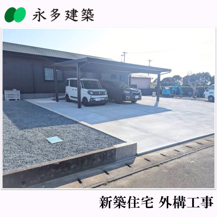 余裕を持って車を出し入れできるように大きめのカーポートを付け、土間コンクリートを打って仕上げました。