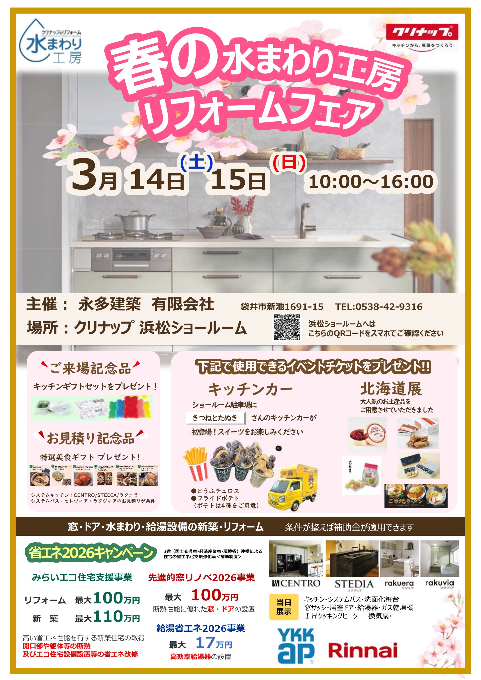 リフォームフェア クリナップ 浜松ショールーム 春の暖かい陽気を感じるこの頃ですが、皆様いかがお過ごしでしょうか? さて、3月14日㈯ 15日㈰ 「春の水まわり工房フェア」 を クリナップ浜松ショールームにて行います。