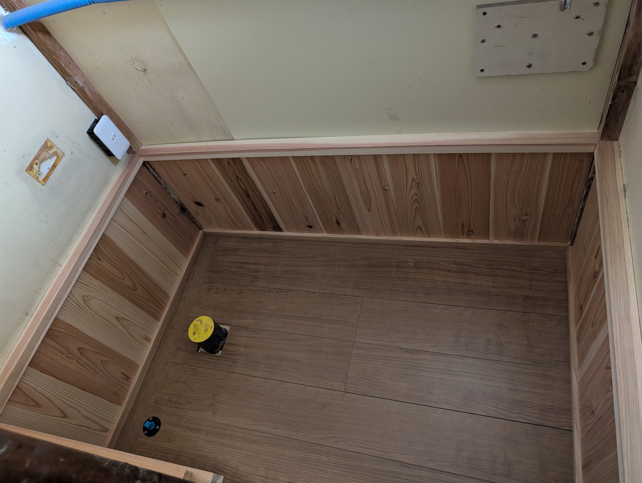 いままでのタイルと違い 床板と腰壁に杉板を貼りおしゃれに仕上げました。