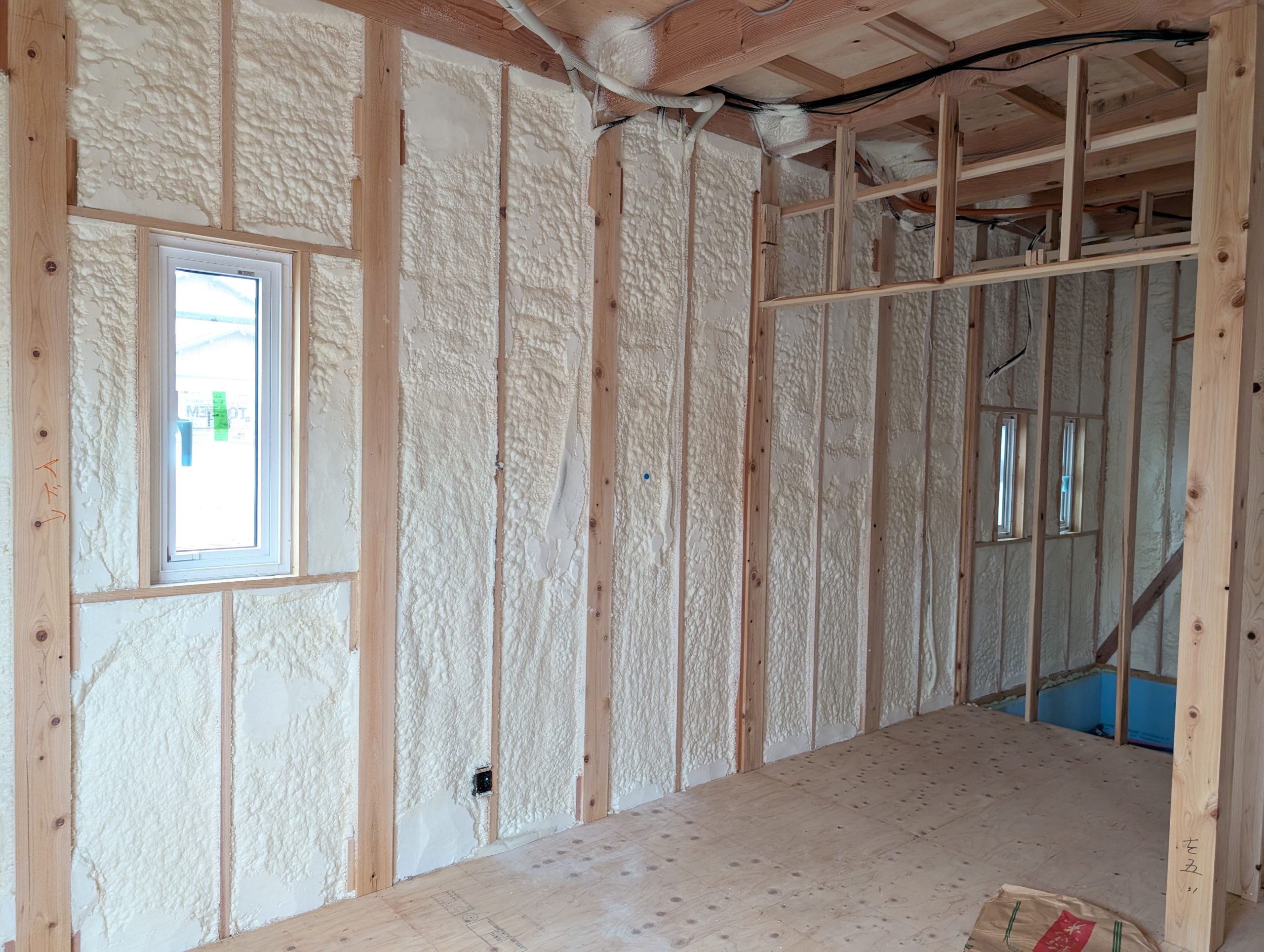 【重要】 図面上での断熱性能が高くても、施工ミス、施工不良によって実際の断熱性能が下がってしまっているという例が数多くあります。断熱材というものはその性質上、住居が完成すると壁や床、天井に隠れて目に見えなくなるものですから、仕様通りに断熱材が使われているかどうかを確認できるのは「工事中」のタイミングしかありません。断熱材がしっかり留まっていなくて下がってきていたりすることがあり、どんなに性能の良い断熱材を使用しても、施工がしっかりしていなければ断熱性能は低下しますし、壁の内部結露などを起こしてしまう可能性もあります。